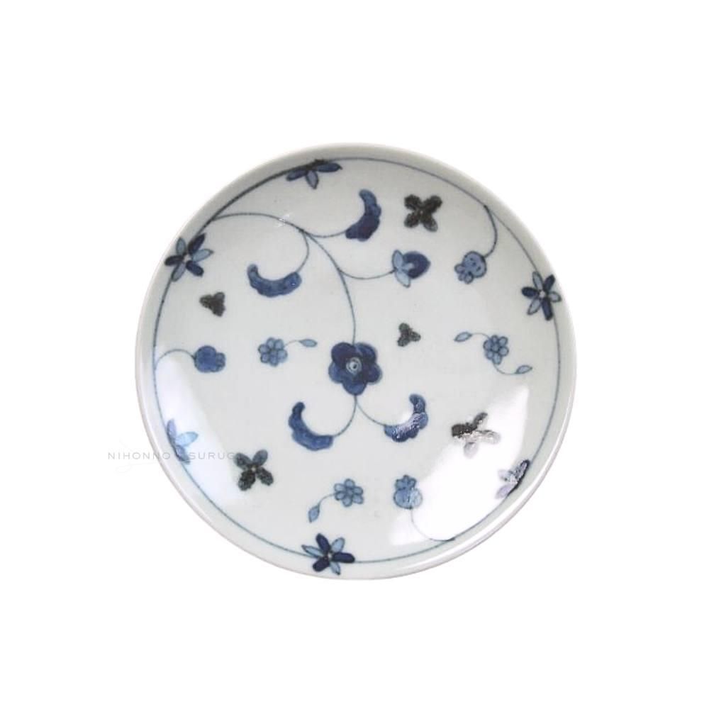 ゴス色の濃淡で描かれた唐草紋様が落ち着いた雰囲気のうつわ。